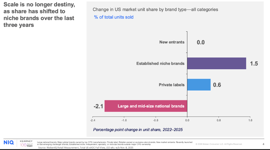 Bu çöküşün pazar paylarına yansıması ise acımasız: 2022-2025 yılları arasında büyük ve orta ölçekli ulusal markalar birim paylarında 2.1 puanlık bir erime yaşarken, yerleşik niş markalar 1.5 puanlık net bir artış elde etti. Ölçek artık bir avantaj değil, hantallığın ta kendisi.