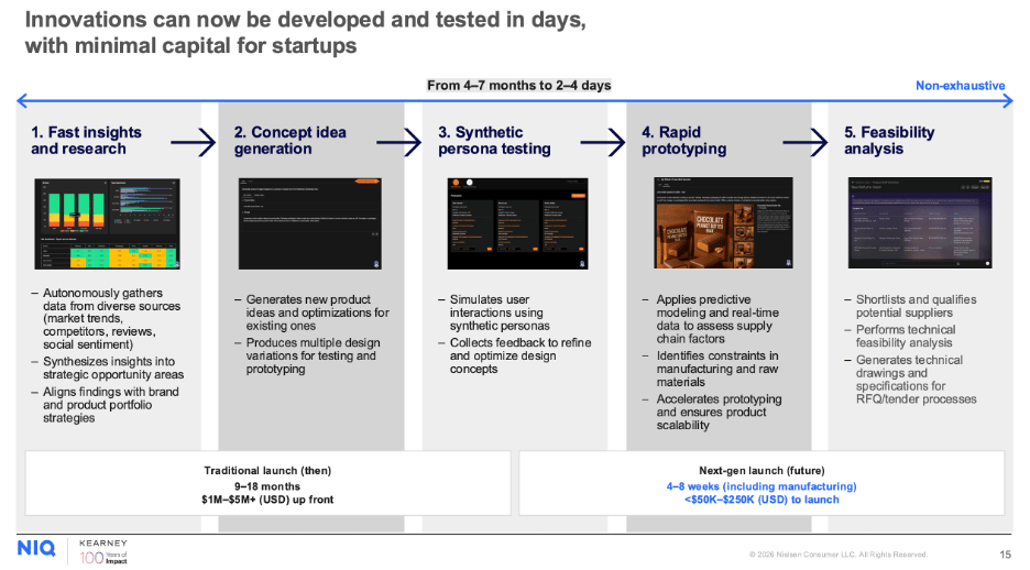 Bu inanılmaz talebe dev şirketlerin ağır yönetim kurullarıyla yanıt vermesi çok zor. İnovasyon yeteneği, büyümenin en temel karakteristiği haline geldi. Geleneksel bir ürün lansmanı 9 ila 18 ay sürerken ve 1 milyon ile 5 milyon dolar arası ön yatırım gerektirirken, bugün yapay zeka ile kurallar tamamen değişti. Yeni nesil bir lansman sadece 4 ila 8 hafta sürüyor ve maliyeti 50 bin dolarlara kadar inmiş durumda. Müşteriden gelen e-posta şikayetlerini ve online yorumları yapay zeka ajanlarıyla saniyeler içinde tarayan, sentetik personalarla ambalaj ve formül testleri yapan niş markalar, dev holdingler daha toplantı ayarlayamadan yeni ürünü rafa (ve algoritmaya) sokuyor .