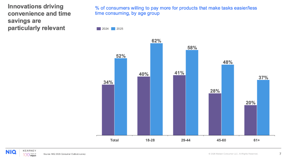 Enflasyon yorgunu tüketici fiyata duyarlı olduğu kadar, pratikliğe de aç. 2025 verilerine göre, görevleri kolaylaştıran ve zaman tasarrufu sağlayan yenilikçi ürünlere daha fazla ödeme yapmaya gönüllü olanların oranı, özellikle 18-28 yaş arası gençlerde %62 seviyesine fırlamış durumda.